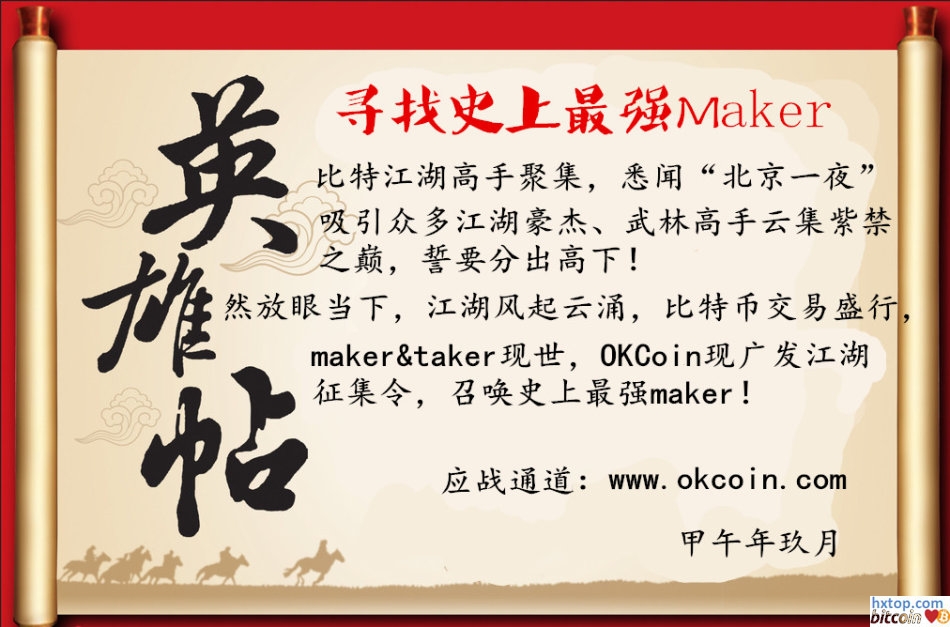 活动时间:2014年10月27日-2014年11月23日 活动规则: 1.所有maker赚取双倍手续费,赚1000送1000,赚10000送10000; 2.活动期间maker 高手日冠军可获得0.1BTC的奖励; 3.活动期间maker 高手周冠军可获得1BTC奖励; 4.活动期间maker 高手活动总冠军可获得10BTC奖励; 颁奖时间:每周3发放上一周的冠军。 友情提醒:周冠军、日冠军每人限领一次,给别人点机会嘛~ 每位比特狂人都渴望站在世界的顶端,来OKCion.com,决战紫禁城之巅! 本文转自:http://weibo.com/p/1001603770672521290528 |