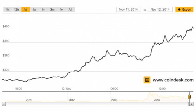 ![]() 比特币价格已越400美元,截止今天发稿上涨超过9%。 CoinDesk上次的BPI价格指数收于400元以上是在九月下旬,虽然在十月中旬比特币价格短暂的冲到了409美元。