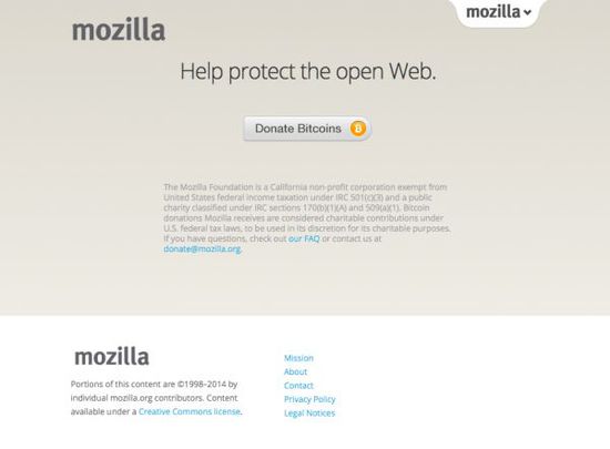 用户现在可以通过Coinbase公司捐赠比特币。Mozilla基金会始建于1998年,Mozilla已经拿出了多款伟大的网络产品,同时坚守互联网的核心价值:开放,透明和权力下放。Mozilla基金会2003年开始小型的开放源码项目,最后演变成今天的Firefox浏览器,这是当今世界上使用最广泛的互联网浏览器之一。
