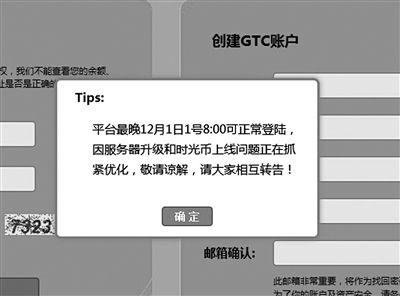 吸引客流 上线拉下线 类似“传销” 11月中旬,有网友在微博上发文称,自己周围的朋友都投资了一个“GTC”挖矿平台,平台号称日赚90至999元人民币,但是获得回报的人没有几个,而且没有公司对接人、网站备案等信息,“简直是网络传销”。 当时,北青报记者在一个名为“GTC挖矿”的百度贴吧中看到,已经有不少玩家开始操作GTC。记者发现,几乎每一个GTC玩家都会有一个上线,所谓上线就是介绍你加入游戏的人,他会给你一个链接,且负责你今后游戏过程中的答疑解惑,当然,这一切并非义务劳动,在你使用他的链接进行注册并购买工具开始挖矿后,上线将获得一定的酬劳。只需用户名和邮箱即可注册一个账号,所用邮箱无需通过任何认证,也就是说一个邮箱可以注册多个用户名。仅仅完成注册是不能开启挖矿“赚钱”模式的,必须用网银充值现金币,现金币以美元形式出现,及经1:6的汇率换算后进行购买,1现金币可兑换GTC不等,根据卖家挂牌出售价格确定,多数情况下可以1现金币兑换1GTC的价格成交。 效率不同的挖矿工具,价格差异也十分明显。作为新手,“上线”建议记者先买一副手套作为工具,一副手套需要花费50个GTC即300元人民币。手套每日最多可开采5GTC,20天可采100GTC,100GTC全部挖出后,手套工具损毁,需再进行投资。除手套外,还有矿锄、挖掘机、霸天虎等挖矿工具,工具的级别越高售价也越贵。 购买完装备,点击个人主页的“开始挖矿”就可以开始“赚钱”了。挖矿过程中,进度条随时显示每日挖矿进度,每天挖满六个小时,就可以使工具的利用程度达到最大化。在服务器关闭前的半个月左右时间,每日只需登录而不用开着电脑挂机就可以后台自动挖矿。 挖出的GTC有两种方式可兑换为现金。其一是可以随时挂牌出售,出售价格自己拟定,但需排队进行。例如,将1GTC的价格定为1现金币,但在售价格为1现金币的GTC有13万个,那么需要等待前13万GTC售完才能轮到自己的GTC被玩家购买。以现金币的形式提现,平台会收取0.3%的手续费。其二则是在周末两天进行直接提现,即GTC直接转换为现金打入银行卡。但该种提现方法不仅有时间的限制,同时要求玩家的兑换数量必须大于等于40个GTC,并将收取0.5%的手续费。 一些用户为了早日收回成本,选择私下交易,直接联系需要购买GTC的用户进行转账购买。除此之外,也有一些玩家群体会集体收集GTC,在周末进行统一兑换。这样做的好处是即使个人手头没有40个GTC,也可以借助积少成多的力量提前完成兑换。 记者体验:“挖矿”容易兑现难 在网友的推荐下,北青报记者加入了一个名为“GTC网赚创富团队”的QQ群,群成员一共有269人,网名都修改为“上线XX”,“下线XX”,上线就是拉人入群的人,下线就是被拉进来的,像记者这样的新人,“上线”拉“下线”注册可以获得一定的返利。群成员经常在里面交流自己买了什么工具、挖了几天,上传自己的转账记录。有一天,一个人入群后说GTC是骗人的,便被管理员踢了出去。 北青报记者进入GTC挖矿平台的网站,发现网站上并没有备案信息。北青报记者在GTC平台注册,花了300元人民币买了50个GTC,获得“手套”一副,开始挖矿。每天只要点击“开始挖矿”,系统就会自动挖六小时,收获5个GTC,按照一个GTC兑换1美元,相当于挣了30元人民币。 由于提现需要40个GTC以上,在第一个周末北青报记者并未获得提现的资格,但到了11月末的周六,北青报记者已经挖了50个GTC准备提现,却发现平台无法进入。从12月开始,记者发现GTC网站平台已经无法打开。 另外,在GTC挖矿吧中,已有网友迅速组织起QQ群来,准备维权,他们的QQ网名都改成了“被骗1000”、“被骗3000”、“被骗7000”,以表达自己的不满。原来的“GTC网赚创富团队”撤下了GTC的名字,群成员开始互相安慰,“再等等吧,不是跑路的迹象”,“之前网站也维护过,维护完就恢复正常了”。更多的成员感到愤怒,号召大家报警,投资最多的人投了10万元。 网友讲述:投资2万 结婚聘礼打水漂 腾讯微博网友斌斌(化名)自11月12日加入GTC“挖矿”项目至今已经投资了两万多元。斌斌只是一个普通的程序员,对于月收入三千余元的他来说,这并不是一个小数目。 斌斌是在一个QQ群里看到了关于GTC挖矿项目的广告,然后上网搜索加深了了解,“当时对这个东西是否靠谱,我自己也是半信半疑的,但是经过两天的观察,在漫天的广告和金钱的诱惑面前,我确实是动心了”。 第一批投入的4500元资金在第十天时如期收回了4000元的收益,这让斌斌对GTC平台产生了一丝信任,他逐渐开始把这个项目看成了自己的事业。“虽然收回了4000元,不过我还是明白,这平台迟早会跑路。但是投机心理搞怪,走火入魔似地又投了钱进去,第二次投资18000元后,自己心里有点开始没底了”,斌斌说。 “本来到12月25日,连本带利我能收回5万元钱,后续再做投资起码能保证本金的安全”,但从11月29日开始,GTC挖矿平台一直以网站维护为名暂停服务器运行,直至12月1日该网站的登录页面已变为“访问被拒绝”。 现在,斌斌最庆幸的是自己没有把身边的朋友拉下水,“本来已经让朋友准备好钱,但是考虑到有风险,想自己做稳定了,再拉他们进来一起赚钱。”投资的两万元是他辞职时领取的一次性工资,本想结婚时下聘礼,但如今他却不知道该怎样跟自己的女朋友解释。 “必须得说了,女朋友已经开始怀疑了。之前每到12点我就开