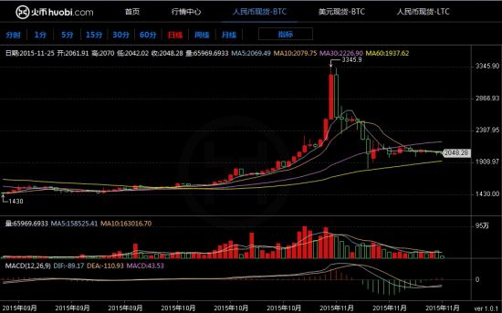 11月24日,根据中国的最大的比特币交易平台火币网行情显示,横盘近15日的比特币价格短期出现小幅波动,最低跌至2020低点强劲反弹至最高2073附近,目前持稳2000-2100一线。