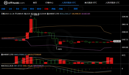 根据中国最大的比特币交易平台火币网行情显示,受避险买盘推动,比特币价格26日上涨50元,最高涨至2135元位置。