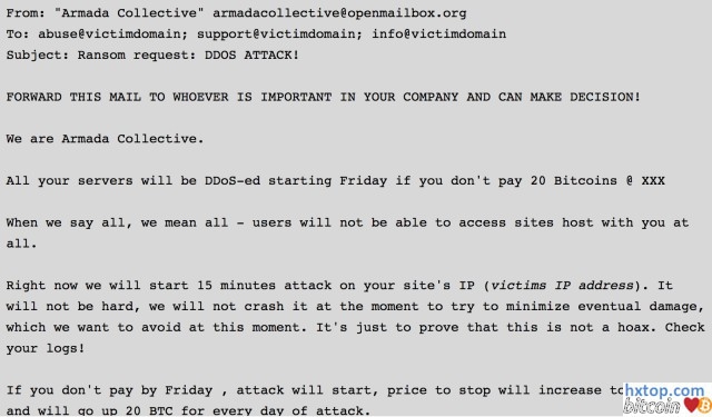今天的坏人是Armada Collective(无敌舰队)。显然这个充满海盗范儿的黑客组织得名于西班牙的无敌舰队(Armada),他们所做的事也如海盗一般,手段残忍、目标明确、逻辑简单,那就是——DDoS攻击+勒索钱财。 具体的步骤是这样的: 1、选定一家公司,一般是看中稳定性的互联网服务商 2、发来“贺电”邮件,告诉对方要发起DDoS攻击,想消灾的话,就要给钱。 3、发起攻击15分钟,秀一下肌肉。让对方知道,哥是认真的。 4、如果对方拒绝支付,就发起连续攻击,直至收到钱。