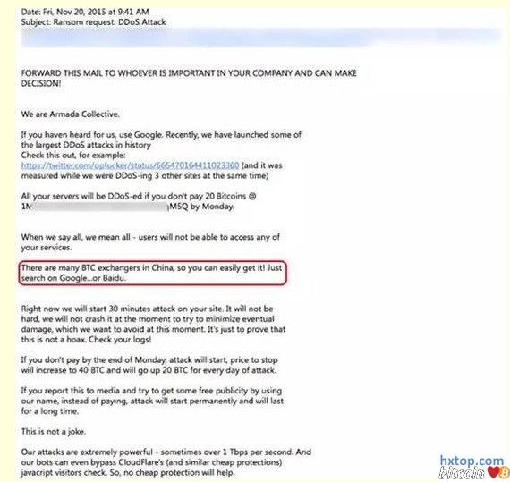 比尔-盖茨独白:怪我咯 实际上,这种勒索模式相当古老,可以说有狗那年就有了DDoS勒索。只不过,随着云计算的兴起,大量资源触手可得,让DDoS攻击的成本断崖般下降,而人们对于互联网服务的可靠性要求又在不断加强,这就使得DDoS攻击所造成的破坏力与日俱增。所以这种没有那么高技术含量的勒索方式重新成为流行,用诗意的语言来说就是——沉渣泛起。 这两天,无敌舰队“出海”频繁,全球各大金融机构和互联网服务商都不小心被“咬”。 ProtonMail是瑞士一家保密邮件服务商,他们的邮件究竟有多保密呢?这么说吧,他们是恐怖分子ISIS“官方指定”合作单位。不久前ProtonMail收到了无敌舰队的恐吓信:不给钱就死磕,最大1T的流量攻击,你们等着吧。 ProtonMail早就听过无敌舰队的江湖喝号,紧张万分。然而咨询了多位安全专家之后,他们得到的建议是——不给钱,看他们怎么样。但是,当无敌舰队在一天之内打瘫了它的服务器,并且直接放倒了公司所在的两个数据中心和ISP,数百家企业受到连累的时候,这家连恐怖分子都不怕的公司实在顶不住了,又紧急咨询了多位安全专家,这次安全专家给出的建议是——赶快掏钱!要多少给多少! 20比特币紧急汇入了无敌舰队的指定账户后,更悲催的事情发生了——攻击变得更猛烈了。在随后的两天,不仅服务器完全被击垮,甚至连数据中心都遭到严重破坏。 让人折服的是,第三天的时候,ProtonMail才意识到,新的攻击并不是来自于无敌舰队,而应该是某政府背景的黑客组织。这个组织并没有联系ProtonMail。这下可好,手捧诸多比特币准备消灾的ProtonMail发现,想给钱都不知道该给谁。 明显没有职业道德的第二次攻击目的很明确,就是造成ProtonMail彻底崩溃。有分析人士认为,这和ISIS使用该邮件系统进行串联不无关系。七天以后,攻击终于减弱,已经满身弹孔密集恐惧症发作的ProtonMail才算是可以喘气。 敲诈遇到反恐,ProtonMail顿感流年不利。抛开这个插曲不谈,大多数无敌舰队类的黑客勒索组织还是很有“职业道德”的。花钱免灾,互不相欠,手法干净利落。 敲诈行业风生水起,领跑世界的中国互联网企业怎么可能幸免呢?就在上周,乌云放出预警,某中国著名互联网企业收到了勒索邮件。 中国企业收到的勒索邮件截图 邮件里,这个狂妄的黑客组织表示,“你们不认识哥的话,就去问问谷歌”,并且贴心地附上了报道他们罪行的新闻链接。不得不说,无敌舰队在进入“中国市场”之前,还是做了相当多的研究。在邮件中,他们表示: 你们中国有很多比特币交易的平台,给我们汇款相当方便,别以为哥不知道。 如果不会汇款的话,就谷歌一下,不,还是百度一下吧 现在我们会先攻击30分钟让你们尝尝厉害。(喂,大哥不是说好了15分钟吗?知道天朝盛产土豪,连攻击时间都翻倍吗?)