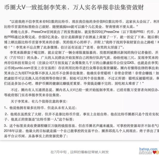 ICO项目马勒戈币的宣传页面,该项目宣称自己已经ICO成功 某一次上币之后,群里面开始议论纷纷。刘晶超去看,发现许多矛头正对准他。“骂我是垃圾,骂我们这个平台垃圾,这个团队是垃圾。”原因是“才涨了三倍,才涨了两倍”。刘晶超郁闷地发了朋友圈。“你只用了一个月不到,是什么支撑你要30倍、50倍的投资回报率?你哪来的信心?” 似乎所有人都在进入这个市场,而且所有人都认为赚钱理所应当。 在散户为几只ICO代币不可思议的涨幅沉醉的时候,刘晶超则看到:散户的幻想跟现实距离越来越大,随着流通币种的增多,币价的涨跌也越来越两极分化。 薛蛮子看过一轮ICO项目后的判断是:如果按照VC的标准要求,大部分的ICO项目都无法过关,甚至达不到进门的标准,在技术、市场等等都有缺陷;创业者简单而幼稚,并且混入了大量以希望获得10倍、20倍、30倍利润为目标的投机者。 相比传统从天使轮看团队看demo,到A、B、C轮看数据、看收入、看利润的风险投资,ICO这种只有一个“白皮书”的募资模式,判断依据少之又少,并且画饼和空手套白狼的操作空间巨大。 “目前看的90%的ICO都是不靠谱的,很多人实质是捞钱,赶紧给自己扯上ICO,然后赶紧弄一笔钱。90%的人只关心一上市之后涨5倍、10倍、20倍,对技术是不关心的。它现在就像一个新时代的众筹一样,只要有有名的人,他就跟着买。”薛蛮子说。 一旦价格下跌,危险就出现了。中国股民亏钱了,还有“国家队”来救市,当币圈的散户投资者亏钱了,他们会怎么做? 这个近似股票交易的虚拟市场,其实非常脆弱:没有规则制定人,没有证监会,没有SEC,也没有惩罚措施。团队可以随时跑路或破发,但交易平台却要直接面对不理智的大批散户。 刘晶超开始意识到自己在玩一个危险的游戏。他咨询了法务,一旦ICO出现了问题,应该如何是好? 币久网此时的角色,恰如纳斯达克或纽交所,不同的是,它只是十来个较大交易所中的一个。刘晶超模仿了正规交易所的措施,增加了新的风险警示,让散户们填写问卷来鉴别他们的风险承受能力。 但在炎热的六月,事情已经像滚动的车轮一样无法停止。压力不仅来自于散户,也来自于投资人,圈内的或圈外特别有名的人都推过来各种各样的项目。“哪个也得罪不起”,经过反复思考,刘晶超做出了一个看上去十分荒谬的决定:暂停ICO项目上线,等待市场冷静下来。 不出所料,刘晶超的决定遭到了公司内大多数人的反对:作为一个交易平台,这波牛市几乎是获取用户,实现利润增长的最好机会。刘晶超在公司内部开了三次会,意见仍不能达成一致。刘晶超努力的说服剩下的人,给他们摆了两条路,“第一,继续做,这有可能大家都会死。如果说我们现在提(停止),也许能为行业做些贡献。” 6月26日晚上11点半,在经过漫长的讨论之后,会议室里面的所有人终于达成了一致。同意了刘晶超暂停ICO上线的决定。在做出决定之后,刘晶超让网站运营者起草公告,于凌晨立即发布。 在公告发布之后,刘晶超紧绷的心终于放松下来:“当天晚上那些所有已经同意的人,可能明天又过来说反悔了,说这样做的不好。等我通告发了,就不能再改了。” 刘晶超的预感不久应验。几天之后,火热的ICO市场的涨势嘎然而止。在这一次,许多投资者的愤怒不再指向ICO和交易平台,而是一款ICO项目:EOS,和它的投资者:李笑来。 大V和“50亿美元的空气” 7月,薛蛮子微博发出跟李笑来的合影后,这条微博获得了300余条回复,其中一大半都带着怨气和攻击:有人警告“不要和李笑来同流合污”,有人回复“联合李笑来这样的人来坑中国人自己的钱”,有人嘲讽两人“即将开发新币’李蛮币’(你麻痹)”。 作为币圈里最有名的人、号称“比特币首富”的李笑来,具有巨大的号召力。这也让他的风评最两级分化。 李笑来的EOS上市第三天,投资人大虎抛掉了自己所有的EOS代币,他说自己躲过了进入ICO圈后最大的劫难。 “EOS”有李笑来的背书,创下了7月ICO市场的新纪录 —— 开盘价仅为5.87元,2天后涨到30元,5倍。当时几大明星币种,量子链、公信宝、小蚁币都开始跳水。群里所有人开始讨论这一冉冉升起的新星,甚至此前对EOS持怀疑态度也在这几天选择了噤口不言。 然而,这却引起了大虎的内心怀疑,作为比特币的资深投资者,他对偏离价值的涨跌十分敏感。没有考虑很久,他就做出了选择,在30元出货。 事实证明了大虎的正确:从7月4日EOS持续十多天下跌,到7月16日的时候。EOS 价格为最高价的三分之一不到。尽管价格仍要高于ICO的原始币值,但由于绝大多数散户买进EOS时价格已经处于高位且是急涨,因此他们大多数损失惨重,被腰斩者比比皆是。 本来就富有争议的 EOS ,形象一下随着股票的价格开始跳水,同时还有它最知名的投资者 —— 永远在宣传画里笑着,给人们指引财富自由之路的“币圈首富”李笑来。 EOS全称为“EOS Operating System”,或名为EOS区块链操作系统。由香港公司Block.one开发。根据EOS的说明,它提供了数据库、账号许可、调度、认证和互联网应用通信这些基础性服务,方便其他区块链应用开发者在它提供的服务上进行开发,提高的效率。相对于6月的其他项目,它的白皮书和内容逻辑都十分清晰,开发者是比特股的创始人、著名的区块链技术工程师BM。 但对大多数的外围投资者而言,这些优势都抵不过“李笑来”三个字的简单粗暴有吸引力。
