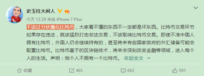 微博原文: 不该过分妖魔化比特币,大家看不懂的东西不一定都是坏东西。比特币交易环节如果存在违法,就该猛烈打击非法交易,不该取缔比特币交易。即使不准中国人拥有比特币,外国人仍会继续持有的,甚至将来有些国家政府的外汇储备可能会配置比特币。比特币基于的区块链技术,将来会深刻改变金融等领域,进入每个人的生活。声明:我个人不拥有一个比特币。 |