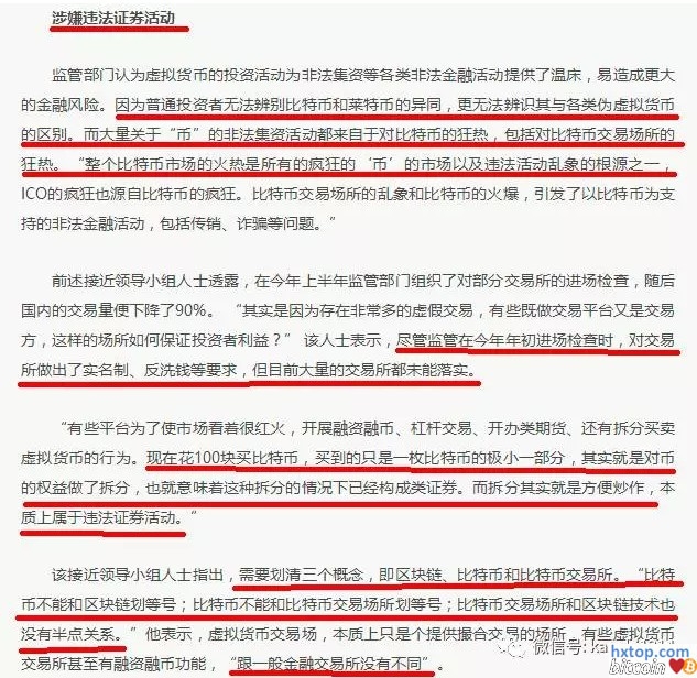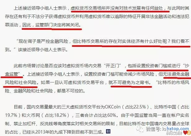 作者:肖磊看市 我在连续准确预测了一系列监管动向之后,本来打算对于虚拟数字货币市场的分析,暂时告一段落,但周末几个主流媒体连续爆出,中国监管层可能有意完全取缔包括比特币在内的虚拟数字货币交易所,其中包括目前全球非常具有影响力的比特币中国、火币和OKcion。 消息来源比较可靠,一个是中国证券报,一个是财新网。 中国证券报隶属于新华通讯社,其宗旨最重要的一条就是,宣传党和国家有关经济、金融、证券的方针政策。 对此,我详细给大家分析一下。 中国证券报和财新网所采访的,所谓接近监管层的人士,实际上可能就是参与此次监管讨论的人士。那么这个监管层到底是哪个单位呢?准确的讲,是去年刚刚成立的,“联网金融风险专项整治工作领导小组”(以下简称“领导小组”)。这也就是为什么此前接受了央行“进驻检查”的火币网、比特币中国、OKcion等并没有得到具体消息的原因。因为不是央行。 “领导小组”隶属于国务院,是为贯彻落实党中央、国务院决策部署,鼓励和保护真正有价值的互联网金融创新,整治违法违规行为,切实防范风险,建立监管长效机制,促进互联网金融规范有序发展。 更重要的是,“领导小组”采用的是“穿透式”监管。什么是“穿透式”监管呢?很简单,就是透过现象看本质。那么关于比特币交易,“领导小组”看到了什么样的本质呢?具体报道中已经写的很明显了,只是很多投资者获取信息的能力有限,甚至只愿意看标题党,或者是只能被动的看被加工过的消息。 我来简单的总结一下“领导小组”是怎么思考的。首先,“领导小组”认为,整个比特币市场的火热是所有的疯狂的“币”的市场以及违法活动乱象的根源之一,ICO的疯狂也源自比特币的疯狂。这句话是非常要命的,因为这就意味着,要从根本上整治ICO乱象,就要从根源入手,从比特币入手。 其次,“领导小组”认为,比特币交易,由于可以拆分买卖,本质上就是对“币”的权益做了拆分,也就意味着构成了类证券,而拆分其实就是方便炒作,本质上属于违法证券活动。 第三,“领导小组”明确指出,比特币不能和区块链划等号,比特币交易所和区块链技术也没有半点关系,要划清区块链、比特币和比特币交易所三个概念。 基于以上三点,实际上这就为直接“取缔”比特币交易所,做了一个完整的解释和说明,让市场做一个提前消化,也试探一下市场的反应。