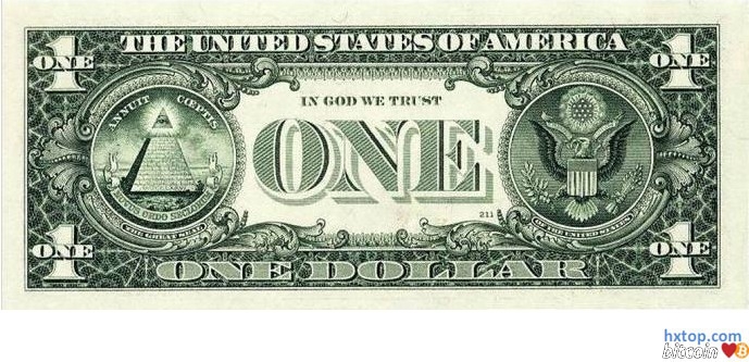 美钞中间印著「IN GOD WE TRUST」的字样,但却遍寻不见可以代表基督教信仰的十字架之类的记号,反之,却见一只鹰和一座金字塔伴於左右。右边是大家熟悉的美国国玺。左边的呢?原来是美国国玺的「背面」(见下图)。至於金字塔及其他埃及意象【留意:「鹰」在埃及代表太阳神】,都是共济会常用的标记。美钞中间的「ONE」字,好像只标明钞票面额,无关宏旨,但在西方神秘学裏,「ONE」常用来代表「上帝」(类似新柏拉图派中的「太一」),却不是基教信仰中的耶和华神。 美国国玺(背面):