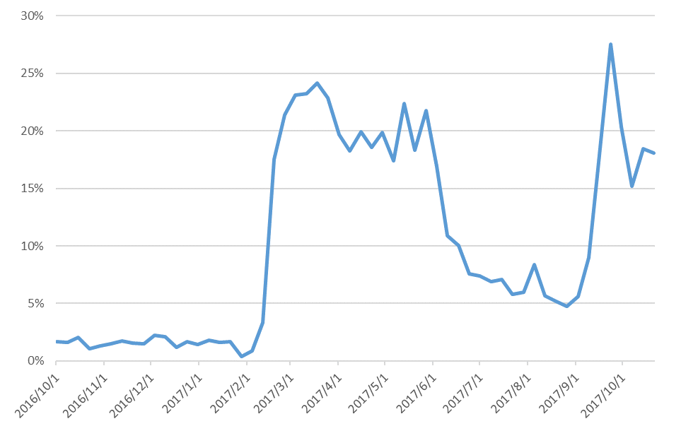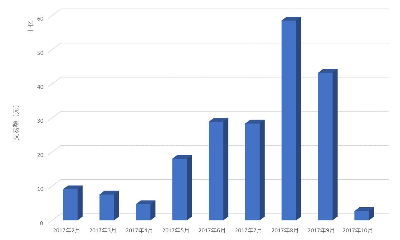 图2 BTC-CNY场外交易份额走势 凤凰网WEMONEY注意到,与BTC-CNY场内交易对比可以看出恰恰相反的走势,如图3所示,2-5月是场内交易规模的低谷,6-8月场内交易规模显著提升,9月份以来持续走低。从交易规模对比上看,目前P2P模式的BTC-CNY日均场外交易金额仅为前期场内交易金额的1/100左右。