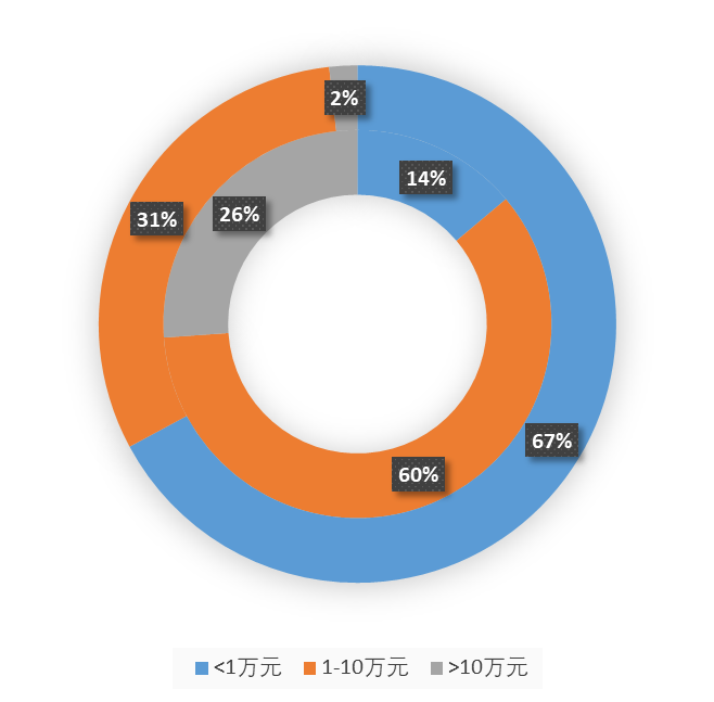 图4 交易额走势与分布情况 从三家平台的订单规模来看,单笔交易金额小于1万元的订单数量占比67%,订单金额合计占比14%;单笔交易金额1万-10万元的订单数量占比31%,订单金额合计占比60%;单笔交易金额大于10万元的订单数量占比2%,订单金额合计占比26%。具体分布如图5所示。