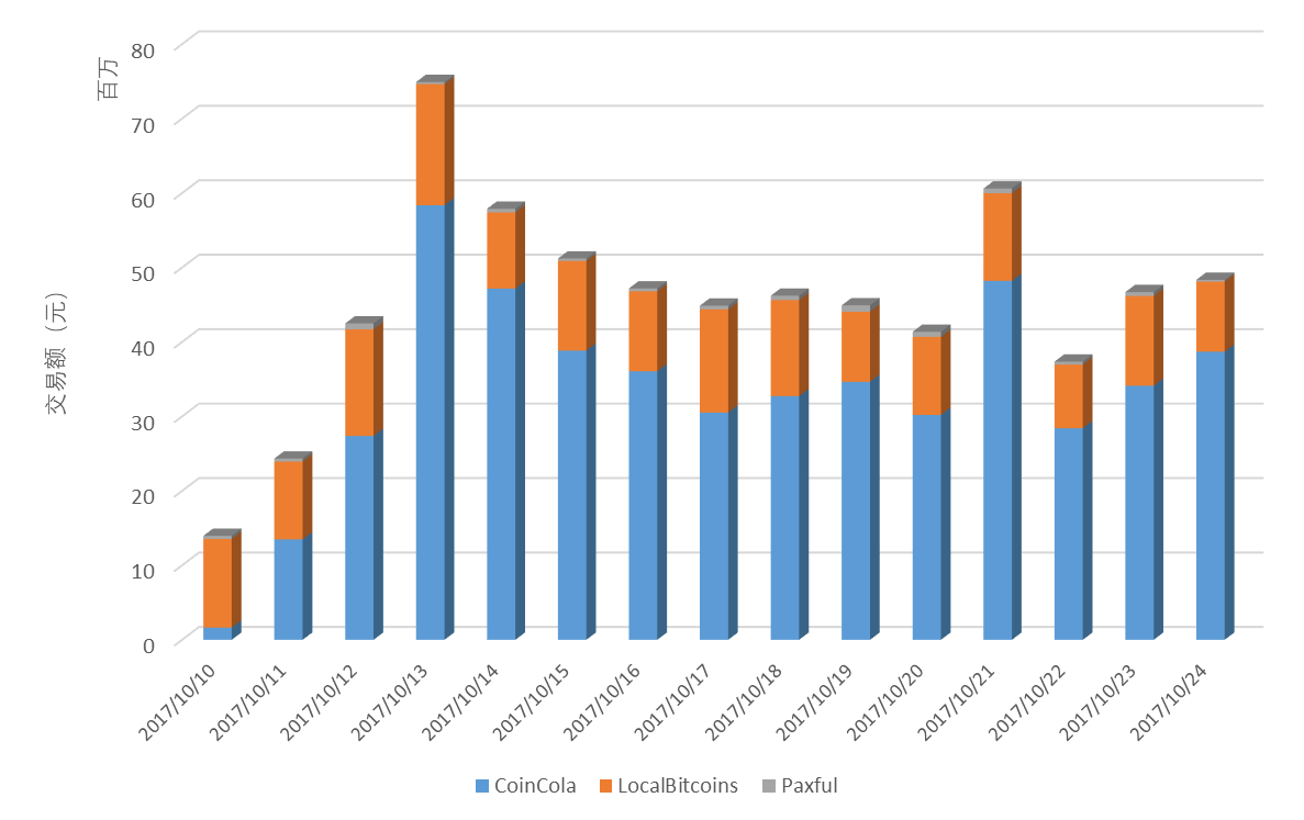 图3 BTC-CNY场内交易额走势 技术平台通过对近两周LocalBitcoins,Paxful,CoinCola三家平台的BTC-CNY交易数据进行分析,从交易规模上看,三家平台合计交易额6.8亿元,其中香港的CoinCola平台交易额增长显著,在三家平台中占比达七成。三家平台近两周的交易额对比情况如图4所示。