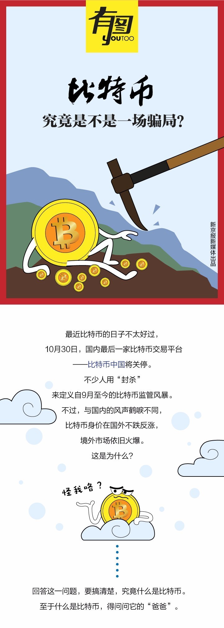 根据比特币中国的公告,10月30日中午12:00平台将停止提现业务,截至目前,比特币中国已经关闭了所有交易功能。 比特币中国是国内三大比特币交易平台之一,其他两个平台为火币网和OKCoin。这两个交易平台将于10月31日停止所有数字资产兑人民币交易业务,其资金、资产的清退工作也正在开展中。 从9月4日开始,监管层先后出手ICO和比特币,如今ICO在国内已经偃旗息鼓,国内比特币交易所的业务先后调整和关停。 不过,这并未影响比特币的行情,在经过一段波折后,比特币重回涨势,按照OKCoin的最新报价显示,比特币已经冲到36021元人民币。 什么是比特币?比特币是否还有前景?比特币未来何去何从,下面一张图读懂比特币: