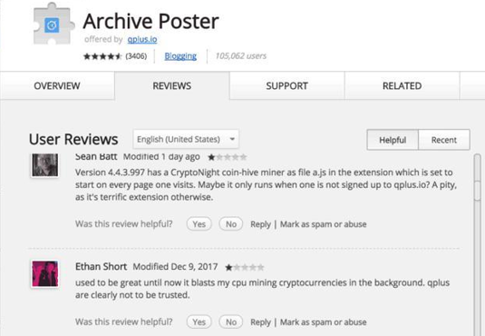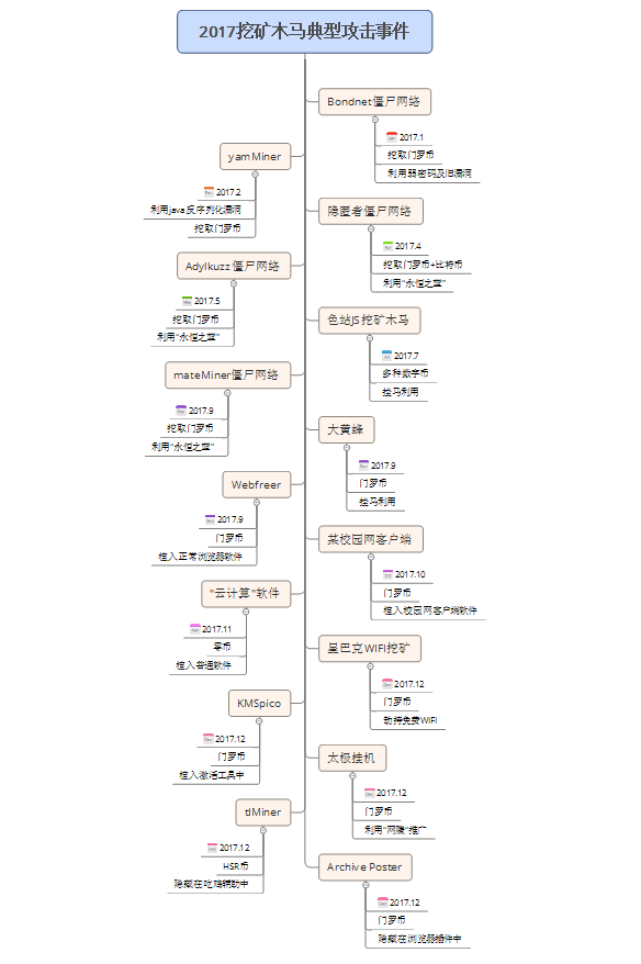 3. 挖矿木马整个2017年行业内频频爆出各种挖矿木马,且木马隐藏手段也越来越高明,实现了从“裸奔”到“隐身”的升级。 1) “裸奔期”:僵尸网络挖矿 上半年“裸奔期”,挖矿木马没有隐藏在普通软件中,而是成为僵尸网络的一个新拓展“业务”,做到了挖矿、DDoS两不误。 2017年5月发现的Adylkuzz僵尸网络,甚至比WannaCry出现的时间要早,影响了全球几十万台机器。有意思的是,Adylkuzz入侵成功后会利用“永恒之蓝”漏洞阻止其他病毒也利用此类漏洞,这在一定程度上限制了WannaCry的传播。木马入侵成功后,就会链接C&C服务器,接受挖矿指令,已知该木马目前专门挖取门罗币。 2) “遮掩期”:植入普通软件挖矿 下半年“遮掩期”,挖矿木马开始隐藏到浏览器、插件、外挂辅助等普通软件进行传播。 (a)浏览器插件挖矿 2017年年底,一个名为Archive Poster 的浏览器插件被爆植入挖矿木马,影响数十万台用户机器。Archive Poster的功能是协助用户在社交平台“汤不热”上进行多账号协作,其开发商表示说,经过调查发现起因是一名团队前成员的邮箱被入侵,导致产品被植入挖矿木马。 (b)外挂辅助挖矿 在2017年年底腾讯电脑管家发现一款名为“tlMiner”的挖矿木马,隐藏在《绝地求生》辅助程序中进行传播。由于《绝地求生》游戏对电脑性能要求较高,不法分子瞄准《绝地求生》玩家电脑,相当于找到了“绝佳”的挖矿机器。该木马由一游戏辅助团队投放,单日影响用户高达20万。 3) “隐身期”:网页挖矿 下半年还是挖矿木马的“隐身期”,挖矿木马不再有可执行文件落地,而是直接嵌入在网页中,在用户上网看小说、看视频的同时“隐身”后台偷偷干活。 2017年9月,数百个色情、小说、游戏网站在其网页内嵌了挖矿JavaScript脚本,用户一旦进入此类网站,JS脚本就会自动执行,占用大量的机器资源挖取数字加密货币,导致电脑异常卡顿。 通过观察2017挖矿木马攻击事件也可以发现,不法分子最喜爱挖的数字加密货币不是比特币,而是门罗币,目前单枚门罗币的交易价格在2500人民币以上。