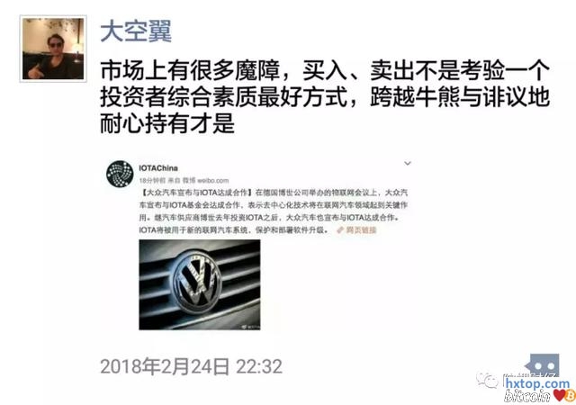 大空翼朋友圈截图 一战成名 有时候,成功仅仅只是因为做对了一件事。 IOTA的投资,让大空翼一战成名。 IOTA是建立在一种新型分布式账本——缠结(Tangle)基础上的非区块链加密数字货币,被认为可以应用在物联网的小额支付场景里。15年下半年,IOTA开放众筹,发行的IOTA代币每个约0.001人民币,大空翼拿着玩币赚到的10万块,一把梭哈了进去,当时中国参与的人不多,大概也只有7、8个,但最后拿住的只有两个人:他和Jimmy,IOTA中国社区负责人。 IOTA最后一共募集了1300多个比特币,价值约三百万人民币。 然后故事就从这里开始了。从15年底到17年6月,IOTA一直很便宜,但自6月ICO热潮开始后,IOTA暴涨,到17年12月初一度涨到约36人民币,相比发行价已经翻了3.6万倍,大空翼手中的10万人民币,也变成了几十个亿。 2017年6月,大空翼发朋友圈表示IOTA“拿了两年一动没动” 大空翼朋友圈配图,这个是2017年6月13日IOTA的价格,12月初达到最高点36人民币 如果大空翼手上的IOTA一直拿到12月,他的收益已经超过三十亿。有人曾经向他求证赚了几十亿的事情,“几十亿?”大空翼发出了不可思议的笑声,“国内肯定没人赚这么多的。”但他紧接着补充了一句:“但一半我知道有人是有的。”这句话看似什么也没说,但其实该说的都说了。 相比于其他币圈大佬,大空翼就是一个草根大V,他没有资本和人脉开矿场,开交易所,发代币,他只是因为一笔投资坚持了3年不动,就轻易地实现了所有人梦寐以求的财富自由,但他也有自己的梦想,如果他当初只甘心做一个矿工,挖山寨币赚点小钱,或是像许多赌徒一样快进快出,今天的币圈,或许又少了一个传奇故事。 赌徒的自我修养 风声鹤唳,风雨飘摇,用这些词来描述近年的币圈毫不为过,到底是什么力量,促使大空翼将全副身家投入并一下子就是3年,当然,你可以说是因为资金量小,所以他放心那样放着,的确有这个可能,但是我们是不是也可以试图,从另一个角度,重新认识这个传奇人物。 币圈是个零和博弈的地方,进场的都想赢,但有赢就有输,通常输的是什么人?是沉不住气的人。 大空翼曾经也输过,2014年比特币有过一次大跌,他当时的100多万一下子亏到了10多万,他一度非常抑郁,“人就是不知足,当时天天拍大腿,就想着如果早卖就好了。”人就是这样,没买之前怕踏空,涨了之后觉得买少了,跌了又后悔怎么不早点卖掉,这是一个死循环,但核心只有一个:当你赚过一次大钱,享受过一夜暴富的快感,你就再也无法接受“赚得更少”的现实。 但大空翼一早就看透了这一点,他认为“买入、卖出不是考验一个投资者综合素质最好方式,跨越牛熊与非议地耐心持有才是”。