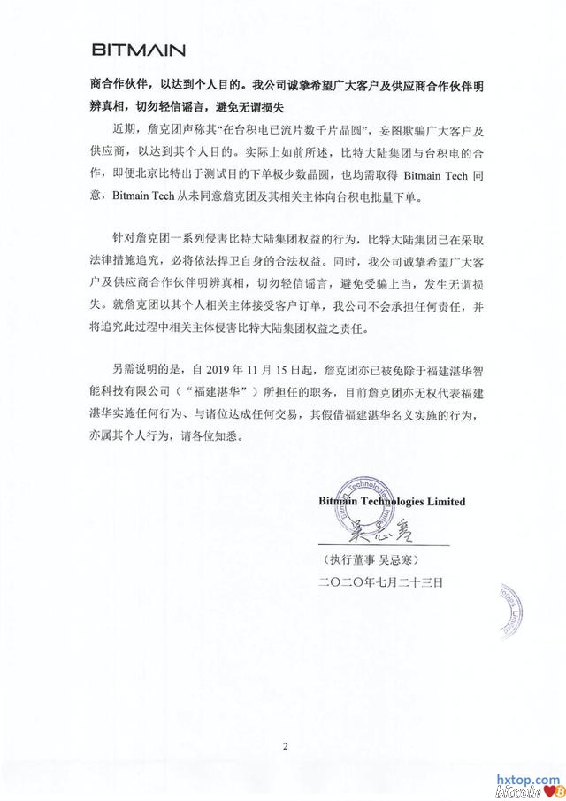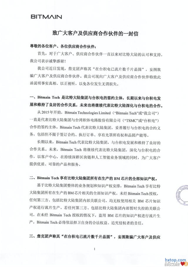 比特大陆昨天发生了什么? 针对“抢”矿机一事,詹克团方面发出了回复,称“抢”的矿机产权是北京比特的子公司福建湛华所有,而吴忌寒将产权转移给了新加坡比特的子公司重庆硅原所有,但这些公司都是开曼比特的子公司。所以一团乱账,各说各有理。 吴忌寒方面发出的另一封信,信息量比较大,它提到了詹克团能否做出矿机的核心:台积电。这家万亿市值的巨兽,或将成为比特大陆内斗的关键因素。 文章透露出几个重要信息: 1:詹克团对客户说已经在“台积电流片数千片晶圆”。(吴忌寒方面指这是欺骗客户,据悉确实与实际情况有较大出入,不管是数量还是时间) 2:吴忌寒控制香港比特一直是比特大陆集团与台积电的签约主体。 3:香港比特享有比特大陆集团所有在生产的BM芯片(比特币)相关的全部知识产权。 4:北京比特下单极少数测试晶圆,也要得到香港比特的同意。 目前双方各不相让,在开曼漫长的官司结束之前,很有可能出现两个“比特大陆”和“蚂蚁矿机”。吴忌寒方面没有供应链,詹克团方面没有芯片,但都在补足这一环节,去造出能够赚钱的矿机。 这封信透露出吴忌寒掌握的香港比特,是台积电的签约主体,因此吴忌寒方面有充足的芯片,由于矿机除了芯片以外都比较简单,重建供应链速度较快,据悉本月就可以发货。 詹克团方面难题在于,虽然掌握深圳工厂,但也需要重新流片,时间很长。而台积电一定还需要支付预付款,需要庞大的资金。这也是詹克团最近不惜冒着违法风险“抢”矿机甩卖的原因。 比特大陆的成功,至少有一半的功劳要归功于台积电。台积电的工艺比三星优秀,这也是比特大陆S19能相对于神马、嘉楠的三星8nm机器性能更好的核心原因。当然台积电也因为比特大陆赚取了大把钞票,曾经台积电大陆的女销售被称为“比特币女王”。 至于双方和台积电的关系,据说最早是吴忌寒带队去和台积电谈判;但后续又是詹克团负责相关沟通,每几个月都亲自赴台打点。有可能双方都和台积电有比较密切的关系。而台积电方面,由于华为产能释放,目前产能相对比较充足。 总之,台积电是绝对的强势方,它的目标只有一个,就是比特大陆更多出货,持续买它的芯片。目前台积电对此还没有回应,它会支持哪一方?会否给詹克团大量的芯片供应?目前尚不得而知,但将成为天平偏向哪一侧的决定因素,相信双方都在不遗余力地努力。 詹克团方面回应: