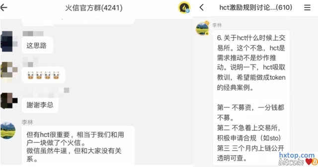 时任火币全球站CEO“七爷”在社交媒体群内接受访谈时表示,火信是李林排除异己坚持做的社交平台。据接近火信人士,火信的负责人早期为“老王”,因出现严重系统漏洞问题,变更为“蛋总”黄河,后由“七爷”翁晓奇继任,后者已近一年未公开露面,负责人已再度变更。2020年,曾有报道提及,火信注册用户达到300万人。 成立之初,火币创始人同名人士李林账号活跃在火信官方群等群组,并曾表示“有htc很重要,相当 于我们和用户一块做了个火信”,有意做币圈用户的社交媒体;并呼吁HCT不着急上交易所,是需求推动不是炒作推动,鼓励用户在平台交流,不要只是收卖币(HCT)。