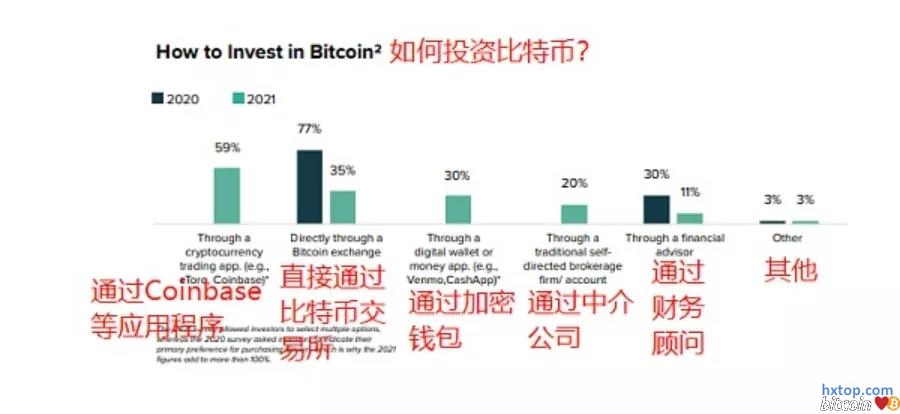 投资者购买比特币的渠道发生了变化。在2020年时,有超过四分之三的投资者更喜欢直接通过比特币交易所购买。而在2021年,近三分之二 (59%) 的投资者表示更喜欢通过加密货币交易应用(例如 eToro 或 Coinbase)来购买比特币,只有超过三分之一 (35%) 的投资者表示倾向于直接通过交易所购买比特币。