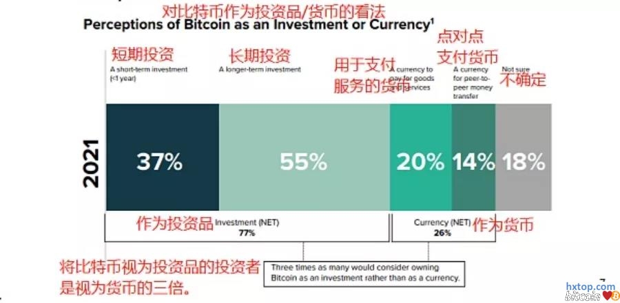 虽然金融机构仍在努力处理比特币在全球经济中的作用,但投资者已经表现出明显偏好比特币作为一种可以积累长期回报的投资,而不是一种用于支付的货币。这是与 2020年相比的一个显著变化,当时比特币作为一种货币比任何其他用例都更受投资者关注。2021年,将比特币视为“价值存储资产”是视为“支付货币”的投资者数量的三倍。其中,超过三分之一(37%)的人认为比特币是一种短期投资,持有时间不到一年,他们可以通过这种方式赚取“快钱”。超过一半 (55%) 的投资者认为比特币是一种长期投资。在将比特币视为“支付货币”的受访投资者中,有五分之一将其视为支付商品和服务的媒介。另有 14% 的人将使用比特币进行点对点汇款。