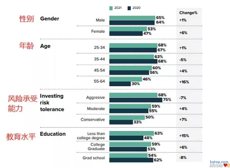 比特币完全是千禧一代(80 后和 90 后)爱好的观点不再成立。事实上,在对比特币表现出兴趣的投资者中,2021年增幅最大的是老年投资者。2021年,55至64岁的投资者比例同比增长16%。与2020年的水平相比,在2021年考虑比特币投资产品的女性投资者比例上升了6%,而这一类别的男性投资者比例保持相对平稳。教育水平不是一个明显因素,与2020 年相比,在2021年没有大学学位的投资者群体增加了15%。