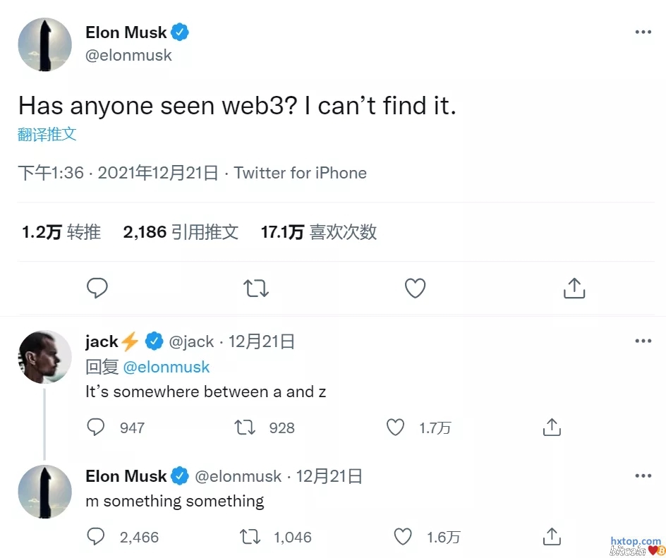 Jack Dorsey 此后又继续抨击,「Web3.0 世界里,VC 才是问题」,暗指 a16z 等 VC 投资了大量所谓 Web3.0 公司,用户并没有享受到真正的 Web3.0 产品。 而在他发布后不久,Musk 同样也对 Web3.0 提出了质疑,在这一点上 Musk 和 Dorsey 达成了一致。有趣的是,被称为「营销大师」的 Musk 也称 Web3.0 只是「营销手段」。 Musk 在推文里表示,「有人看到 Web3.0 吗?我找不到它。」Dorsey 幽默的给出了回复,「它在 a 和 z 之间。」