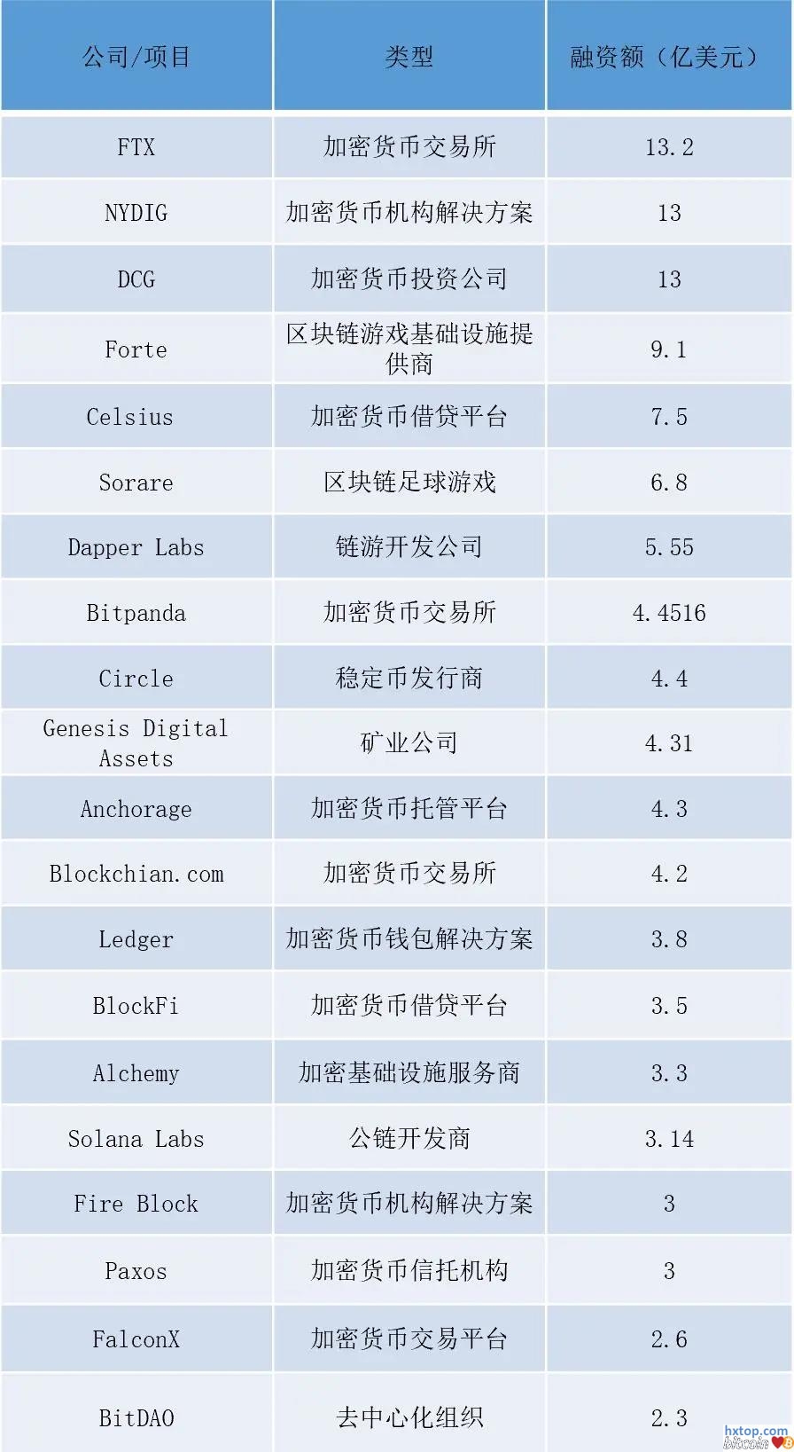 以下为这20家公司/项目的详细信息: 第一名:FTX,总融资金额达13.2亿美元 FTX成立于2019年5月,交易量长期位居加密货币交易所前五,产品覆盖现货交易、衍生品交易、杠杠代币、预测市场、股票代币等,最新轮融资的估值达到250亿美元。 FTX今年的B轮融资由 Paradigm、红杉资本、Multicoin Capital、Thoma Bravo、Ribbit Capital、Insight Partners、Third Point、Lightspeed Venture Partners、Altimeter、BOND、NEA、Coinbase Ventures、Willoughby Capital、40North、Senator Investment Group 、Sino Global Capital以及 Circle 等 60 多家投资方参投,共融得9亿美元。 B-1轮融资由加拿大安大略省教师养老基金、淡马锡控股、红杉资本、Tiger Global等 69 家投资机构参与投资,融得4.2亿美元。