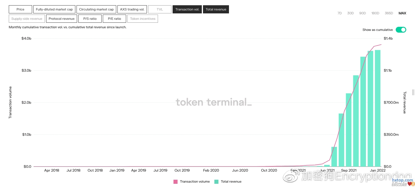 Sky Mavis于 2018 年 5 月推出了 Axie Infinity,作为区块链世界的 P2E 游戏。在其中,用户可以与名为 Axie 的角色一起参与游戏体验,并通过在游戏中获得的奖励来赚钱。 可以说,Axie Infinity在 COVID-19 疫情的影响下,帮助许多玩家在困难时期获得了稳定的收入来源。 那时,一个拥有 3 个 Axies 的平均账户每月可以带来约1,000 美元,这是一个令人印象深刻的数字,远高于发展中国家工人的平均收入。 有了如此庞大的收入来源,2021 年下半年,Axie Infinity 的玩家和交易量都出现了意想不到的飙升。Token Terminal 数据显示,2021 年 12 月 Axie Infinity 的月累计交易额约为38 亿美元,较 2021 年 6 月的 2.06 亿美元大幅增长。截至 2021 年底,游戏总收入约为13 亿美元,增长了 70 倍比六个月前的 1880 万美元。