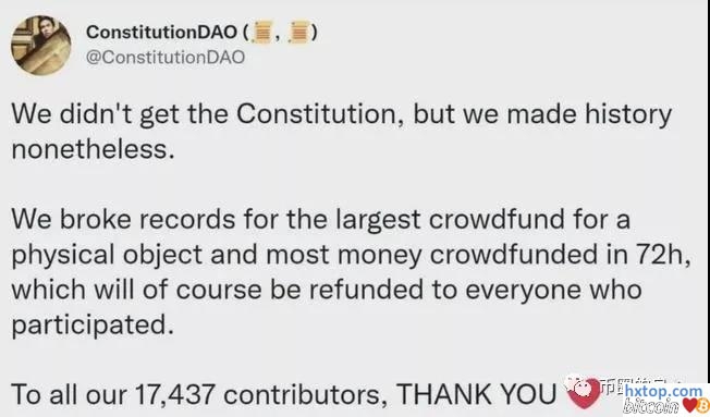 因为区块链公开透明的属性,竞争对手很清楚Constitution DAO的底牌,顶多就是4700万美金。但出价到4100万美金的时候,Constitution DAO顶不住了,原因有两方面:一来除掉拍卖出价外,还有保管费和高昂的服务费。二来更重要的是,如果真的一下子变卖这么多以太坊的话,会对二级市场造成冲击,如果大家争相出逃的话,可能连4100万美金都凑不齐了。思来想去,Constitution DAO不得不选择放弃。事后项目方在推特上说:“我们未能拍到宪法,但我们已经创造了历史。72小时之内,我们打破了最大资金众筹的纪录。当然,钱会退给大家,感谢支持我们的17437位家人们。”