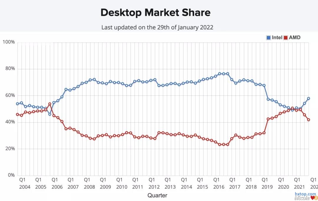 2021 年 Q1,AMD 凭借着 7nm 制程、Zen 3 架构的锐龙 5000 系列 CPU 以高性价比的优势,15 年来首次在桌面 CPU 市场份额上超过了英特尔。随后 2021 年 Q4,英特尔一改过去第 5 代至 11 代 CPU 所使用的 14nm 制程工艺,在 12 代 CPU 上使用了 Intel 7 制程工艺(10nm),并且性能进行了大幅提升,才从 AMD 手上抢下不少份额。不过,AMD 下半年即将发售比锐龙 5000 系列性能更强的锐龙 7000 系列 CPU,英特尔的桌面市场份额是否能够守住优势还需经过市场验证。