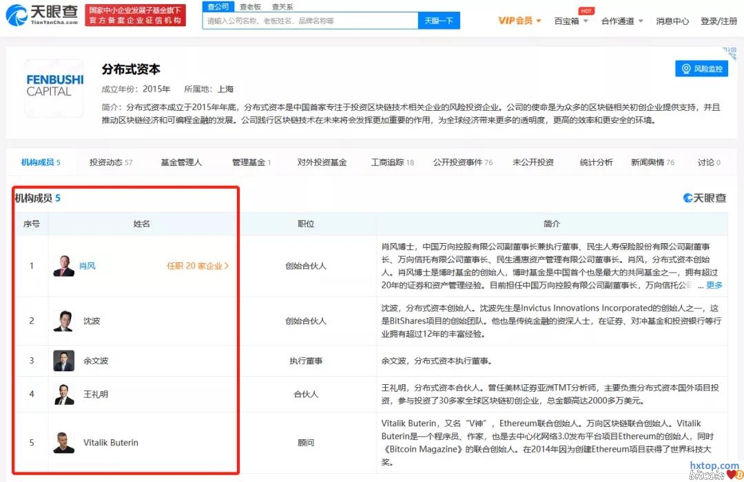 1998年4月1日起,肖风负责筹建博时基金管理有限公司,2011年8月卸任任总经理,任博时基金副董事长。2011年至今任中国万向控股有限公司副董事长。 我们还需要重点关注肖风博士的另两个头衔:分布式资本创始人与投资人、万向区块链实验室创始人。 作为中国区块链技术最早的布道者和推动者,肖风还是6#万向区块链实验室创始人,同时也是3#分布式资本创始人与投资人,拥有多年金融从业经验,在全球范围内孵化、投资了超过50家领先的区块链领域企业。 2#分布式资本:分布式资本成立于2015年年底,分布式资本是中国首家专注于投资区块链技术相关企业的风险投资企业。 重头戏来了!根据天眼查信息,1#肖风、5#Vitalik Buterlin、11#沈波等,都是分布式资本的机构成员。分布式资本则是以太坊在中国最早期的投资机构——赚了上万倍。 2014年,V神带着以太坊白皮书寻求投资之时,正是分布式资本慧眼识珠,投下了这颗代表未来的希望之种。当时17岁的V神带着简历到OKcoin求职时,却被我们徐老板拒绝,恐怕是那个年代最具代表性的灰色幽默(具体细节各位自行查阅)。