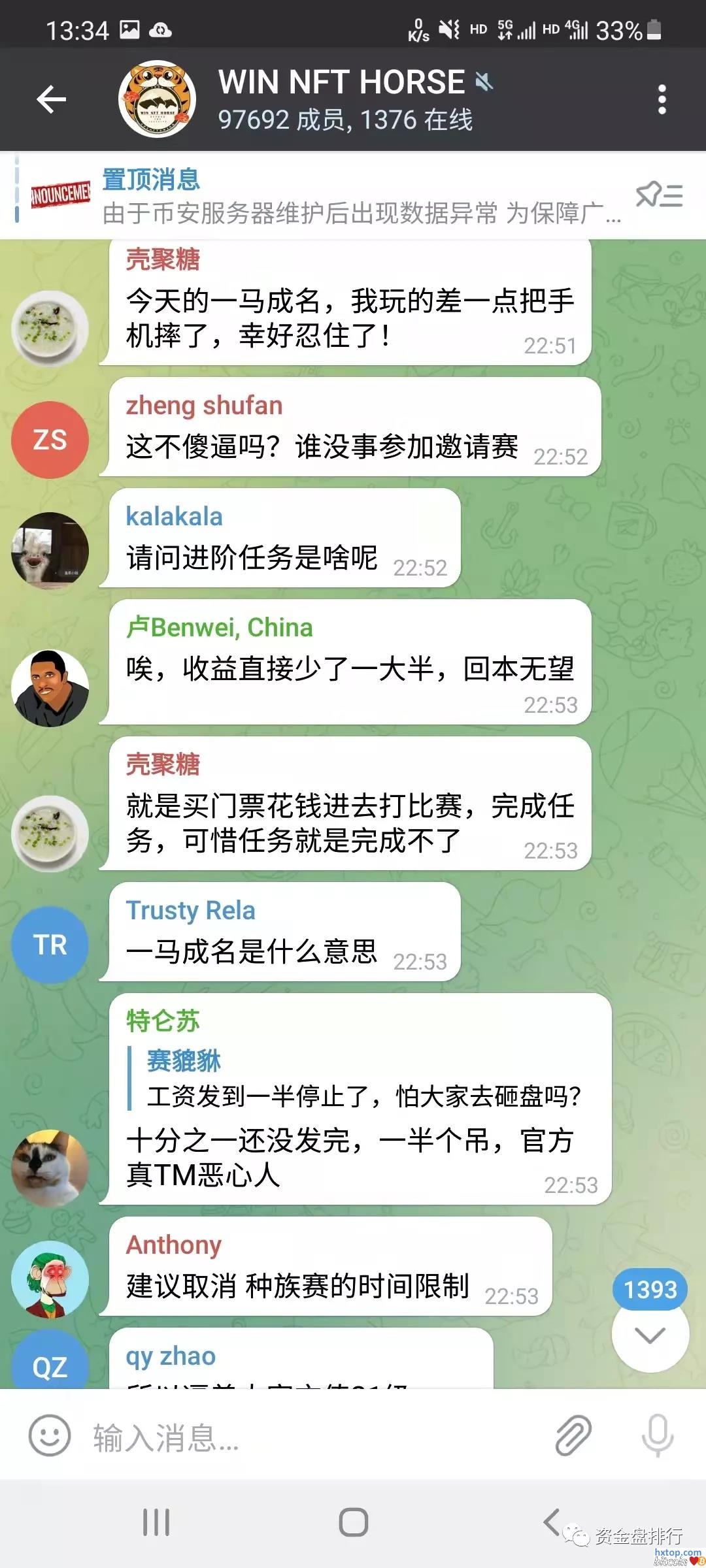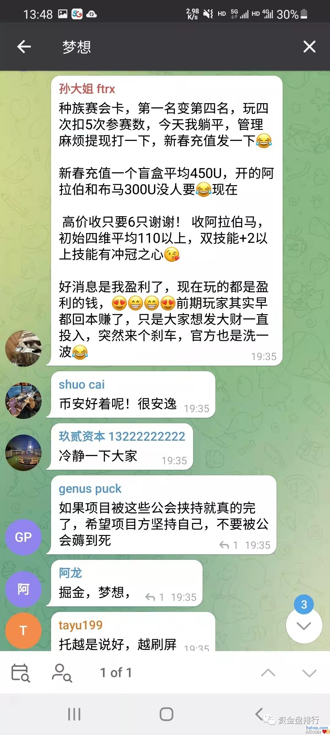 你说公会都跑了,就剩散户你也没法玩。仅仅两天的时间480U的马竟跌到200多U。就这样的跌幅想回本那可是遥遥无期。 孙割的赛马崩了,崩的那么猝不及防。改的规则你完成不了,这不明显的就是不让你玩。赛马修改这个规则,其实用意很明显。赛马到此结束了,只不过用这个规则来给大家过渡一下,直接宣布解散也不行啊。毕竟孙割以后还要割人的。