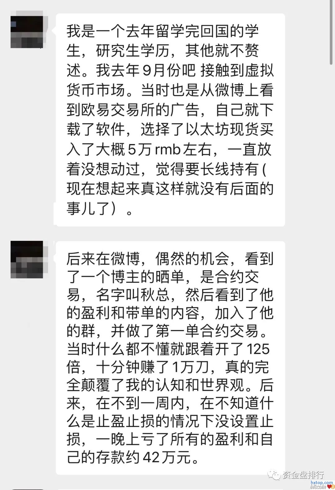 合约暴负例子很多,因玩合约失去生命的也有。所以熊大一直不建议大家去碰合约。 合约就是赌博,人一旦染上赌,你认为能戒掉吗?所以,赌徒,没有一个有好下场,币圈也不例外。 今天看到一位留学生进入币圈玩合约的例子,根据这位币友的陈述,可见进入币圈后因为前期获利快,所以加大仓位去玩,在没有任何技术跟着带单的操作,竟然在一晚上亏掉40多万。 当亏掉这40万时,整个人都是懵的。为了弥补想赚回这40万,这位币友又将自己买婚房的170万拿出来进入市场。说实话,这时候这位币友已经不理智了。确实,真到亏损到一定程度,是很影响你判断的。 拿出婚房的钱进入合约市场,不用多说你也知道结局,那就是又爆了。这时候这位币友应该是清醒了,因为该亏得钱已经亏完了,没有啥本金去翻本,除非又走上另一个不归路,那就是网贷。 这条路是万万走不得,这条路一旦踏入,等待的可能更是无尽的脑悔,作为受过高等教育的留学生,即使不在币圈你还有很大资本在其他领域发展。