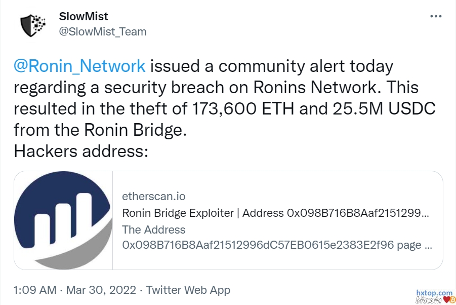 相关信息 Ronin 是以太坊的一个侧链,专门为链游龙头 Axie Infinity 而创建,它自称是将朝着「NFT 游戏最常用的以太坊侧链」方向发展。据了解,Axie Infinity 的团队 Sky Mavis 想要一个可靠、快速且廉价的网络,从而为游戏的发展提供保障。他们需要一个以游戏为先的扩容方案,它不仅要能经得起时间的考验,还得满足游戏快速发展所带来的大量需求。于是,Ronin 链便应运而生了。 黑客地址: 0x098B716B8Aaf21512996dC57EB0615e2383E2f96 攻击细节 据官方发布的信息,攻击者使用被黑的私钥来伪造提款,仅通过两次交易就从 Ronin bridge 中抽走了资金。值得注意的是,黑客事件早在 3 月 23 日就发生了,但官方据称是在用户报告无法从 bridge 中提取 5k ETH 后才发现这次攻击。本次事件的损失甚至高于去年的 PolyNetwork 被黑事件,后者也窃取了超过 6 亿美元。 事情背景可追溯到去年 11 月,当时 Sky Mavis 请求 Axie DAO 帮助分发免费交易。由于用户负载巨大,Axie DAO 将 Sky Mavis 列入白名单,允许 Sky Mavis 代表其签署各种交易,该过程于 12 月停止。但是,对白名单的访问权限并未被撤销,这就导致一旦攻击者获得了 Sky Mavis 系统的访问权限,就能够通过 gas-free RPC 从 Axie DAO 验证器进行签名。Sky Mavis 的 Ronin 链目前由九个验证节点组成,其中至少需要五个签名来识别存款或取款事件。攻击者通过 gas-free RPC 节点发现了一个后门,最终攻击者设法控制了五个私钥,其中包括 Sky Mavis 的四个 Ronin 验证器和一个由 Axie DAO 运行的第三方验证器。 MistTrack 在事件发生后,慢雾第一时间追踪分析并于北京时间 3 月 30 日凌晨 1:09 发声。