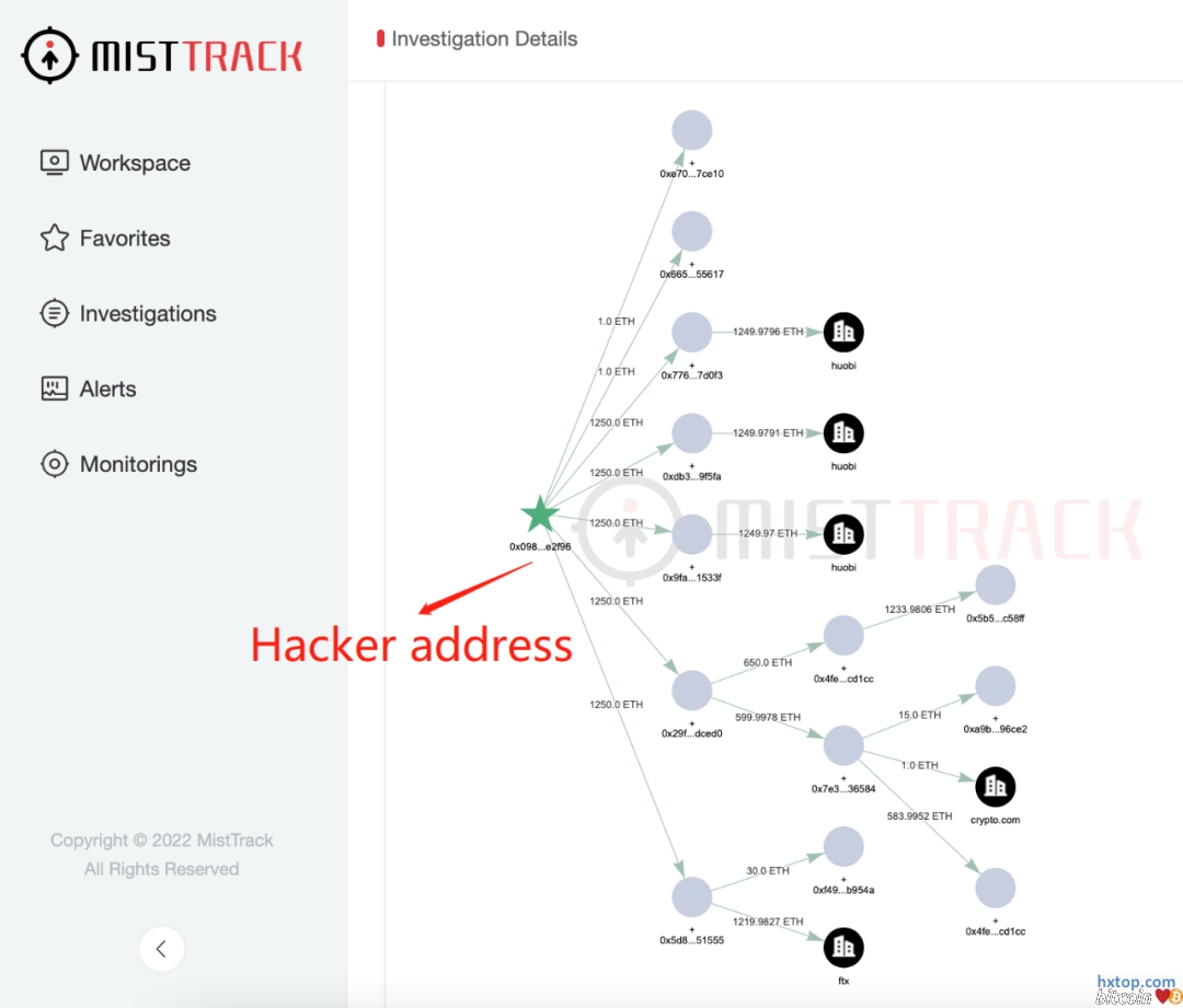 据慢雾 MistTrack 分析,黑客首先将 6250 ETH 分散转移,并将 1220 ETH 转移到 FTX、1 ETH 转到 Crypto.com、3750 ETH 转到 Huobi。
