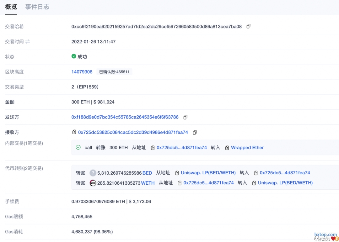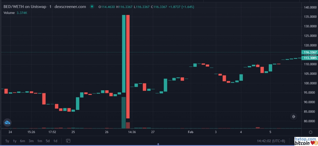 相似手法,却遇「黑吃黑」 2022年1月26日有黑客以类似的手法攻击了借贷平台Rari的Index Coop Pool,但结果却是攻击失败。 攻击者首先买入285 ETH 的BED(WETH、WBTC、DPI组成的合成资产),希望大幅抬高BEP价格影响Uniswap V3 TWAP预言机,再抵押提前准备的BED借出其他资产。
