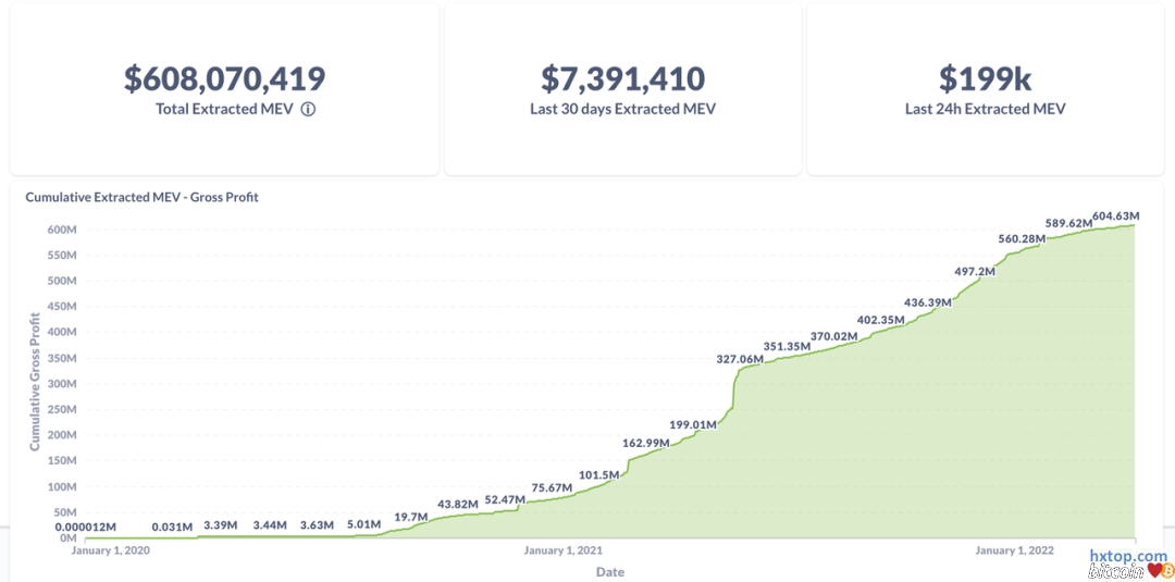数据显示,截至4月8日,MEV提取价值已经达到了6.08亿美元,其中99.4%来自套利。过去30日的MEV提取价值为740万美元。