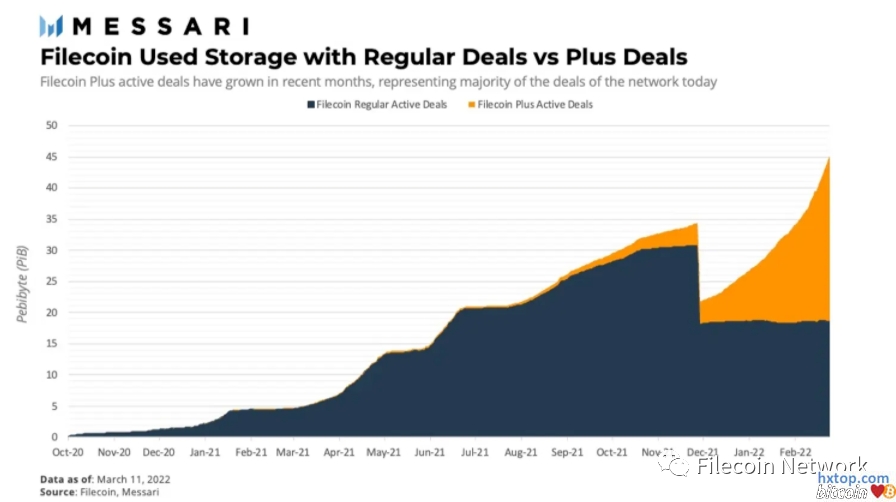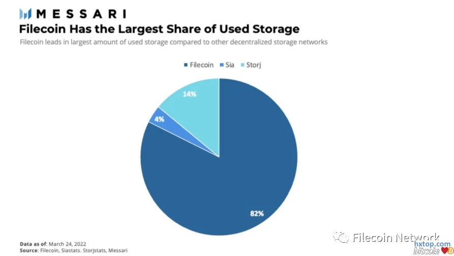 虽然供应大量超过需求,不过存储容量只是其中一方面。网络上被使用的存储数量同样重要。鉴于Filecoin的存储容量为16,000 PiB,而已使用的存储容量为45 PiB,可以算出存储利用率是0.3%. 要理解这些网络指标,那些分布式存储领域的竞争对手,如Sia和Storj各自有6 PiB和 14 PiB的网络容量,它们已被使用的存储则各自是2.2 PiB和8.6 PiB。那么从存储利用率看,Sia和Storj都超过了Filecoin,分别有36%和60%。虽然Arweave有0.05 PiB的数据被存储了,但由于与其他存储网络相比,这可忽略不计,所以并没有包含进来——它从较小的基数增长,但并没有足够的网络容量。