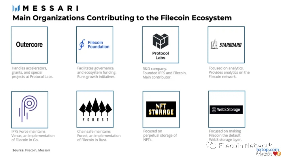 Filecoin Plus项目的引入迈出了一大步,而培育Filecoin新业务和新使用场景的协作行动正在开展。Filecoin生态正引入大量不同的使用场景:从NFT分布式存储到音乐和视频流媒体,再到元宇宙和游戏。 开发者和创建者生态 Filecoin获得了几家组织的积极支持,它们的共同目标是发展Filecoin生态。这些组织联合成立了生态工作组(Ecosystem Working Group)。这个工作组参与者的责任包括维护和升级底层协议、支持生态成长及协助治理。这个工作组里最知名的成员包括协议实验室、Filecoin基金会和Outercore。下图展示了主要的参与机构。