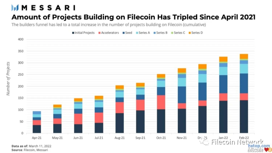 这些组织一直积极通过黑客松、加速器、资助(Grant)计划、导师计划和增长支持,来搭建开发者和创建者通道。这个通道旨在帮助早期项目和团队发展,以到达融资阶段。这样,有超过330个项目正在Filecoin和IPFS上搭建。下面是这个通道的细节,展示了项目的演进过程,并以其成熟阶段分组。