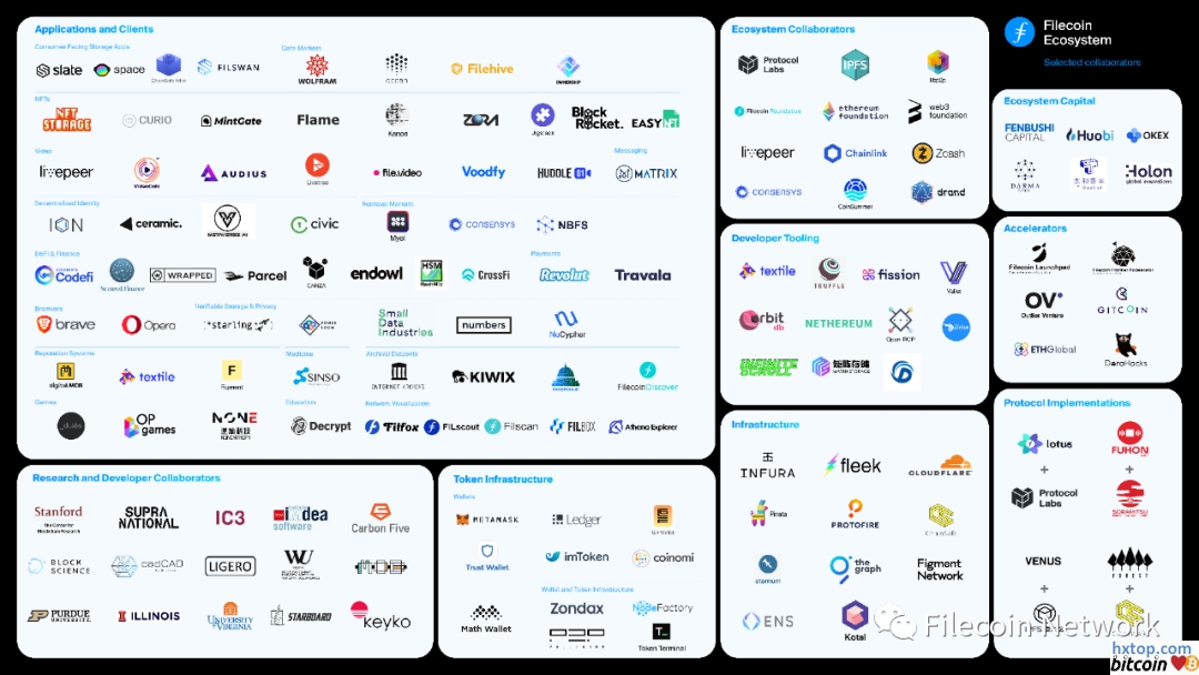 2022年的主要目标是让生态里尽量多的早期项目增长为成熟业务,如从早期阶段进入D轮及之后的融资轮。 整体看,这个生态展现出了显著增长,如与应用程序和客户端的整合、开发者工具和基础设施。最近,生态工作组将简化终端用户和开发者与Filecoin互动的工作排上优先级。这带来了如Textile Powergate、Estuary和NFT.Storage等服务的开发。Filecoin生态的所有使用场景可以在这里(https://ecosystem.filecoin.io/)查看。一部分生态参与者的图表也在下面展示了。