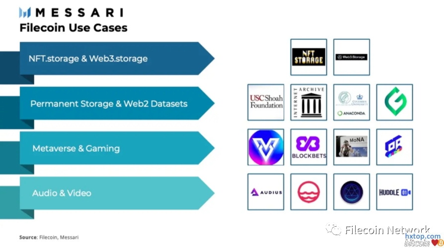 Filecoin的主要使用场景 Filecoin生态很庞大,正急剧扩展,并将自己定位为分布式网络的支柱。随着云存储需求的增加,Filecoin提供了替代流行的中心化平台的方案。现在已经出现了不同的额外使用场景,而还有新的将会在不久的未来实现。有四类使用场景已经有很高需求了:(1) NFT和Web3存储,(2) 永续存储和Web2数据集, (3) 元宇宙和游戏,(4) 音视频。