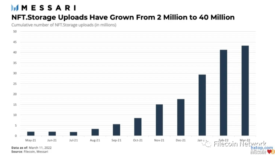 NFT Storage 在2021年夏天,NFT得到了主流关注。由网络效应驱动,NFT主导了加密领域,形式是社交媒体头像、精致艺术品、收藏品和音乐等。有趣的是,很多NFT会用链下的存储位置来存储其元数据,因为在链上进行存储并不现实。在2021年的狂热潮没多久后,很明显有很多NFT的元数据并不是以去中心化、无法操纵的方式存储,这危及了NFT的内容和价值。为了解决这个缺点,NFT.Storage诞生了。 NFT.Storage(https://nft.storage/)利用Filecoin和IPFS专为NFT内容和元数据,提供简单的分布式存储解决方案。它通过由NFT.Storage和Filecoin管理的专用IPFS服务器,来提供永续的冗余存储。在加入了Filecoin Plus激励项目后,NFT.Storage可以免费提供无限量的NFT存储空间。 在2021年4月发布后,NFT.Storage已经支撑了4000万份NFT数据的永久性存储,总共超过260 TB数据的规模。这个服务的易用性让包括个人艺术家和大型市场(如OpenSea、MakersPlace、MagicEden、Holaplex、Jigstack和Galaxy)在内的广泛用户都可以利用永续性的NFT存储。