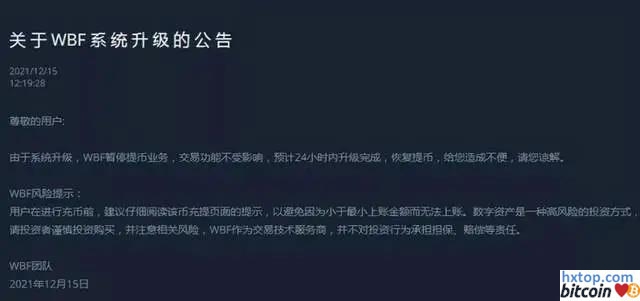 在前段时间,有用户爆料,WBF交易所突然发了一个系统升级的公告,告知用户会暂停提币功能,24小时后再开启。
