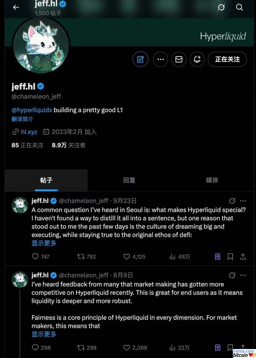 没错,这也是今天 Polymarket 们正在做的事情。从这个角度看,Jeff 确实领先了 N 个版本。 这也不是事后诸葛亮的吹捧。从还能搜到的公开信息来看,Deaux 的设计理念主打链上 / 链下混合、高性能订单匹配和去中心化结算,与今天的 Hyperliquid 也有相似之处。 Jeff 看到了正确的方向,也设计了合理的方案,只是 Deaux 没能起飞。它的网站如今已失效,社交媒体账号也停留在了 2019 年。 领先十步的代价,可能就是生不逢时。 2018 年的 Crypto 市场刚从牛市巅峰跌入寒冬,用户关注的是币价何时反弹,而不是如何用链上预测市场赚钱。更重要的是,当时的加密基础设施,如公链性能、钱包体验、和用户教育等都还不够成熟。 一个需要频繁交易、对延迟敏感的产品,很难在当时的技术条件下提供流畅体验。 但项目没做成并不意味着失败。2020 年前后,Jeff 创办了 Chameleon Trading,也就是 Hyperliquid 的前身。无论是预测市场还是衍生品交易,本质上都是「订单匹配 + 风险管理」的游戏。 这次,他把目标锁定在了永续合约交易上,一个更成熟、需求更刚性、用户更明确的市场。 同时时机也恰到好处。FTX 在 2022 年崩盘,市场对中心化交易所的信任跌至冰点,去中心化交易的需求被彻底点燃。 但 Jeff 没有走复制 Uniswap 或复制 dYdX 的老路,而是选择了一条更难但更彻底的路径,自己做 L1 链。 同时,它不依赖外部流动性提供商,而是通过 HLP(Hyperliquid Liquidity Provider)机制,让用户直接参与做市。更激进的是,它采用零手续费模式,靠代币经济学和生态增长来支撑运营。 从 Deaux 到 Hyperliquid,你能看到 Jeff 做项目的连贯性:都是链上 / 链下混合、高性能订单簿、去中心化结算。 只不过这一次,他选对了赛道,也踩对了时机。 隐身创始人 有趣的是,尽管 X 上关于那张照片的讨论越来越热闹,Jeff 本人从未对此发表任何评论。 翻看 Hyperliquid 的推特账号,你几乎看不到 Jeff 的个人照片或生活分享,只有产品更新、技术文档,以及偶尔的 meme; 而 Jeff 本人的账号里,也很少涉及个人 IP 的打造,更多的是在谈产品和优化,以及对市场的看法。他的上一条推文,还停留在 9 月 23 日。 这种相对低调的风格,似乎并不太符合加密行业强调强营销、制造注意力的节奏。大多数创始人热衷于 AMA、播客、会议露面,把个人 IP 打造成项目的一部分。 但 Jeff 看起来是另一个路线,隐身在代码和产品背后,用交易量和用户增长来回应质疑。或许这也是他能从 Binance Labs 孵化营走到今天的原因之一,不怎么在乎外界噪音,专注做有连贯性的产品。