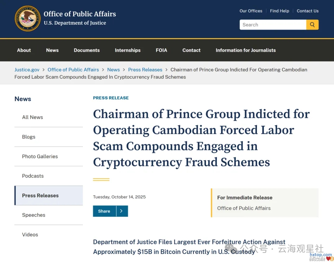 陈志跌倒,美国吃饱。 2025年10月14日,美国司法部宣布了一个震惊世界的消息,没收华人ChenZhi(陈志)持有的约127271枚比特币,总价值150亿美元。
