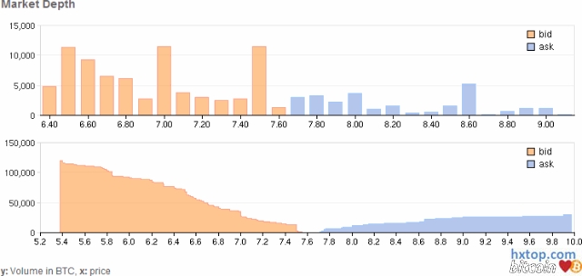 文/端宏斌 目前在网上关于比特币的资料都局限于技术和应用层面,有关价格走势的分析是少之又少,其中由国人用中文写的技术分析文章几乎为零。本文就来谈谈比特币K线图的技术分析,其他都不谈,就只讲价格走势。 比特币是新生事物,因此没有现成可供参考的资料,原本我准备用股市的技术分析往上套,但很快就发现不可行。股市技术分析全都基于均线,其中最重要的就是每天的收盘价,但比特币没有收盘价,它是一天24小时运转的系统。如果硬要画个均线,你会发现基本上没有参考价值。 幸好比特币有一系列自己的技术指标,其中最重要的就是“市场深度”Market Depth,如下图所示: