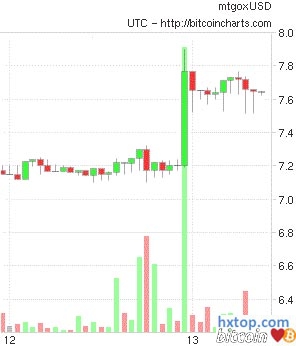 图中X轴是价格,Y轴是量,bid=买单,ask=卖单。此时此刻市场价大约在7.6美元左右,你可以在图上很直观的看到这个价位上下的买单和卖单数量。在股票的软件中,你只能看到上下五档的买卖单信息,你交了更多的钱才能看到上下十档的信息,但是比特币的这个市场深度几乎让你看到了市场全景。近期比特币连续数周的升势,使得买单数量大大多于卖单,从图上可以直观的看到,买单几乎是卖单的4-5倍。 比特币的市场还是很小,这也使得你只需很小的资金就能让价格有大幅的波动,比如下图: