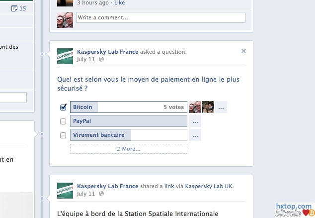 国外社交网站FACEBOOK上的卡巴斯基发起名为"你认为是最安全的网上支付手段"的投票,因国内用户上此网站的限制,只能通过翻墙才能查看.如果你想去投一票请翻墙了.链接https://www.facebook.com/kasperskylabfrance 下面是截图: