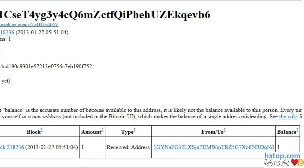 表格中的“Balance”就是指比特币余额,它含有1比特币。