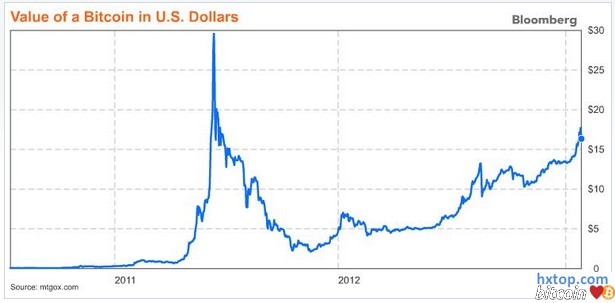 这是两个月前的1月27日的比特币行情走势图,比特币价格从2美元处开始恢复,在5美元处稳定了一段时间,然后用6个月爬升到了16美元。