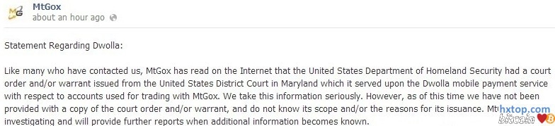 英文原文:Bitcoin exchange service Mt. Gox‘s financial troubles are even more worrying than anticipated. On Monday, GigaOm reported that the U.S. Department of Homeland Security had seized $2.9 million from Mt. Gox’s Dwolla account. But The Genesis Block found out that Mt. Gox’s Wells Fargo accounts were seized as well, adding $2.1 million to the frozen assets. In total, $5 million was seized as Mt. Gox failed to register in the U.S. as a money transmitting company. via Feds Seize Another $2.1 Million From Mt. Gox, Adding Up To $5 Million Mt.Gox的声明: